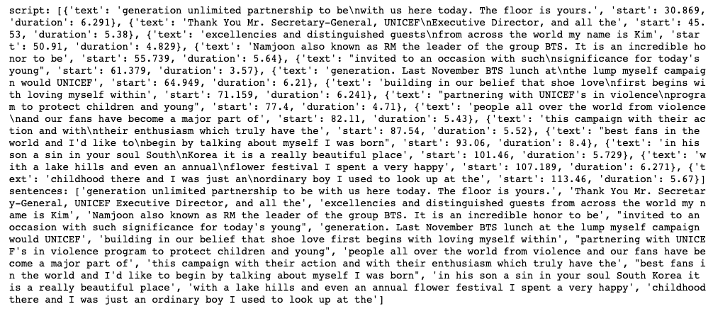 앞의 몇 문장만 보면 아래와 같은데 자막과 거의 같다는 것을 알 수 있다.